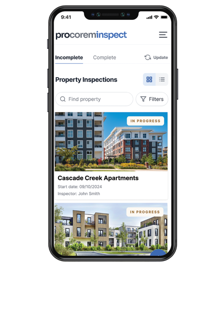 The main page of Procorem Inspect displays in-progress, scheduled, and completed inspections for properties including the primary property photo from ProLinkHFA. These inspections can be synced from ProLinkHFA through Procorem or created directly on the device.